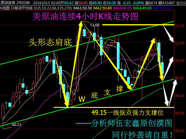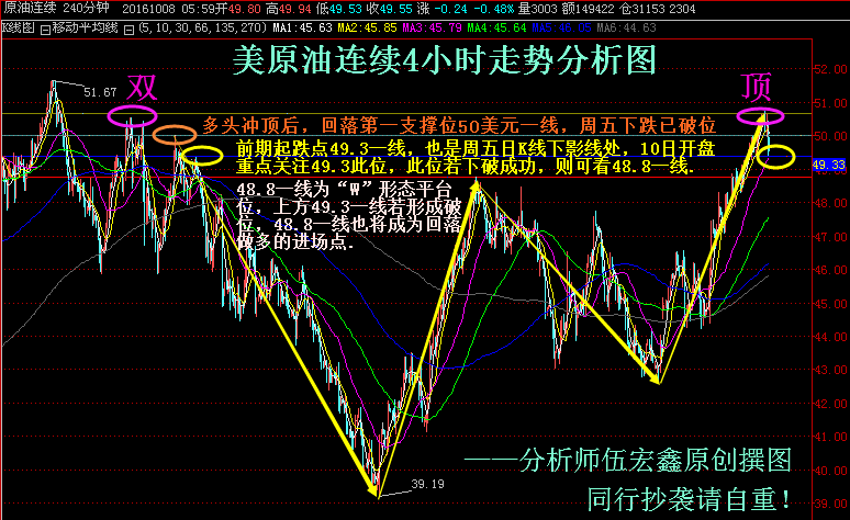 北京时间10月13日伍宏鑫/撰市场上大部分人都还沉浸在低多里面的时候,油价已悄悄的跌至50美元下方去了,就伍宏鑫猜测来看,昨晚的市场又是一片哀鸿,市场大举看多,所以你的多单是毫不犹豫就大胆进场了,没错,在昨日OPEC月报及冻产会议的一些细节公布之前,油价不管是消息面、技术面都是利多的,做多没错,但是当这两大利