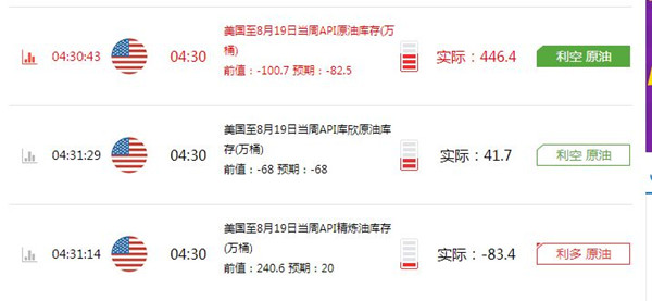 文/雷鼎阳 内容简介 A PI报告 日内原油白银操作建议 伊朗冻产新闻简要解析 消息面 美国石油学会(API)周二(8月23日)称,上周美国原油库存意外大幅增加,但汽油库存大幅下降,精炼油库存也减少。 API公布,截至8月19日当周,美国原油库存增加446.4万桶,至5.242亿桶,分析师预估为减少45.5万桶。库欣原油库存增加41.7万桶。