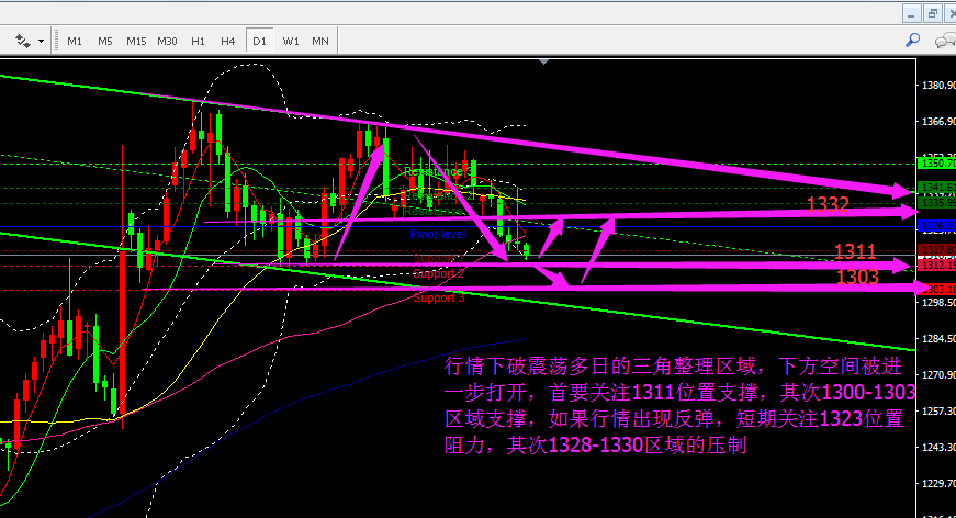 柴俊理金:卖盘介入空头加剧,黄金1330落荒而逃 昨日行情走势意料之中,却出乎意外之外,意料之中在于短线看空行情跌破1330的预期,意外之外在于机构的大量卖盘介入导致金价配合技术面强势下破。从黄金的走势来看,黄金价格自承压1375位置以来,弱势震荡比较明显,短期支撑破位后压力逐渐显现,目前上方1330阻力相对较大,前