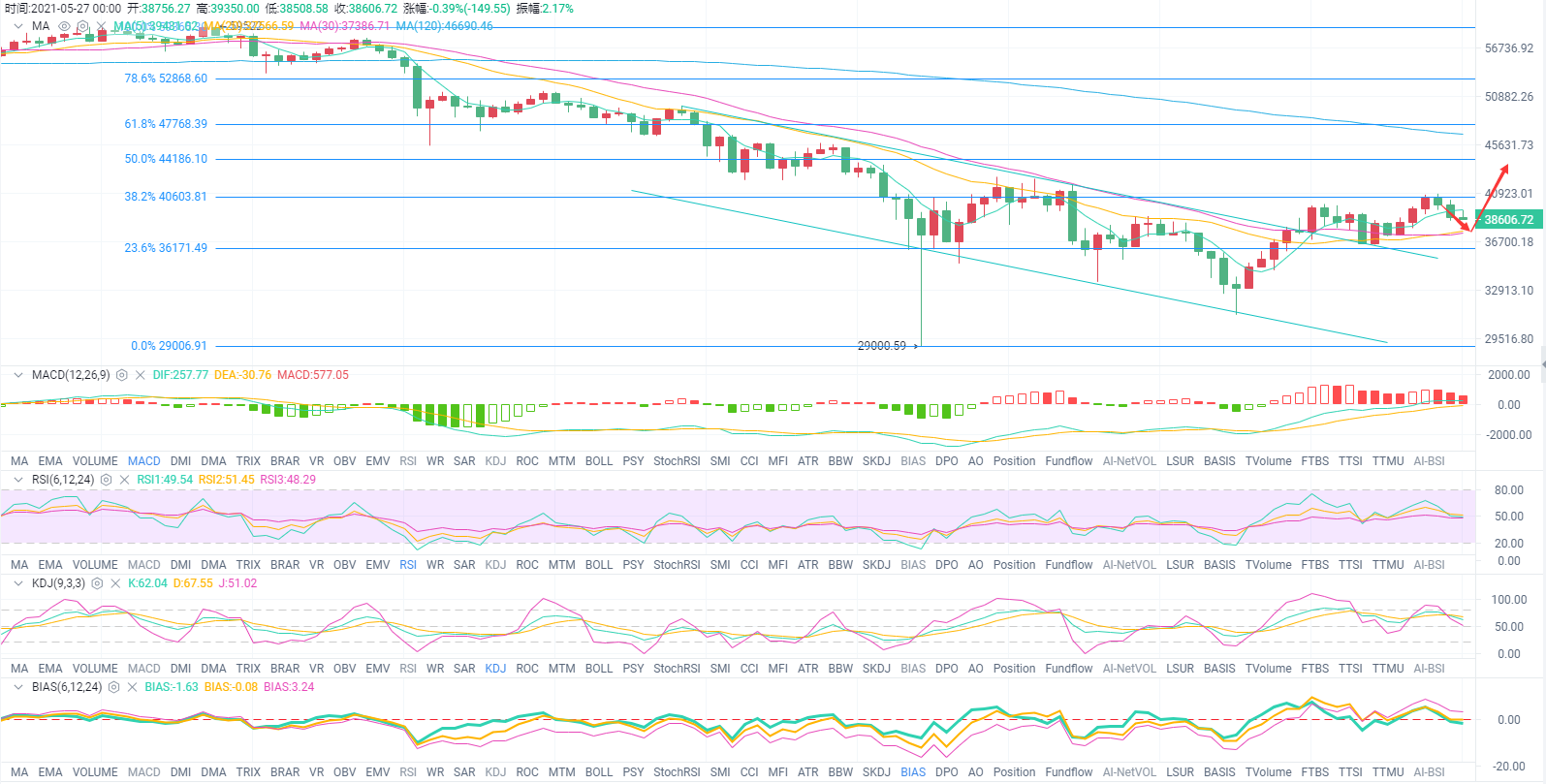 交易无非多空,策略没有优劣,但分析却有高低之分。一个前瞻性、预测性的分析,需要的不仅仅是自身过硬的技术、良好的大局观,更需要过人的胆识和丰富的经验。一次精准的研判是运气,但分析常在,运气不常有,要把交易做好,就必须对市场保持敬畏心,把每一次出手都 当做 历练。 比特币,昨日盘如期上涨给到40700美元后,日线在34288的这根大阳拉伸有效性也得到确认,那么从形态上来说,我认为反弹将会继续。昨日盘回调低点给到36429一线,靠近我们研判的第二支撑位36800美元,走势上,行情短暂回踩后在晚间收出双底形态后,迅速展开第一波拉伸,并且成功企稳MA30日均线压制38600美元,完成区间内的顶底转换后