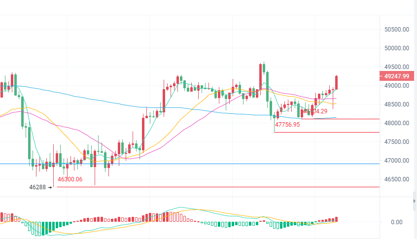 想要看到日出,就要学会等待,想要追寻单边,就要面对震荡。再长的路,一步步也能走完,只要迈开双脚,终点总会到达,行情有时候需要震荡来沉淀,要有足够的时间去酝酿,耐得住寂寞,就能看得到繁华。 ——比特币 比特币(BTC),昨日晚间走势基本符合我们的研判,日内在47750美元止跌后继续上扬,测试49200附近的阻力,凌晨阶段成功到达。昨日分析我们强调过,趋势上当前比特币其实还是围绕着46000-49500的一个多空争夺,走势上现阶段多头占优比较明显,但是结构上的压力也不小,突破企稳以后才是判断强弱的关键。 四小时来看,行情在46288美元止跌后,形态上在46500上方走出多方炮形态,随后冲高小