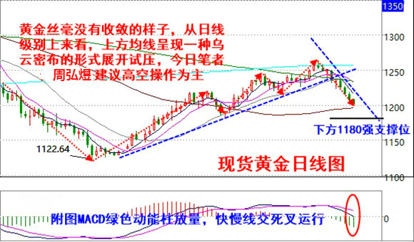 国际黄金隔夜跌势定局回落,美盘时间段的走势也是完全处于趋势之下中,金价在昨日也并没有给予很好的反弹,尤其是在美盘的回落,更是直接性下行,1220的破位周弘煜也是直接看至1216,但是后夜的金价更触新低,最低点也是直接给到1214一线,由此来说空头已经占据整个战场;早间的形态也是一个暂处下轨弱势运行,那么趋势上来