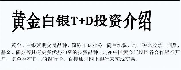 刘智辛:黄金T+D介绍 黄金“T+D”交易是指,以保证金的方式进行的一种黄金现货延期交收业务,是一款股票和期货相结合的专业黄金投资产品。 1、交易时间灵活,更适合平时需要上班的投资者 黄金"T+D"的交易时间: 9:00-11:30 13:30-15:30 21:00-02:30 由于"T+D"可以在晚上进行交易,而且波动最活跃的时候也恰恰是在晚上,所以非常适合平时白天需要上班的投资者,免去了以前炒股票时要在白天看盘的麻烦,这样白天可以专心的工作,而晚上在看电视的同时就可以赚到钱,何乐而不为呢? 2、交易多样化,有做空机制,无需担心资金被套牢 现在中国炒股票的人非常多,在众多股民中资金没有被