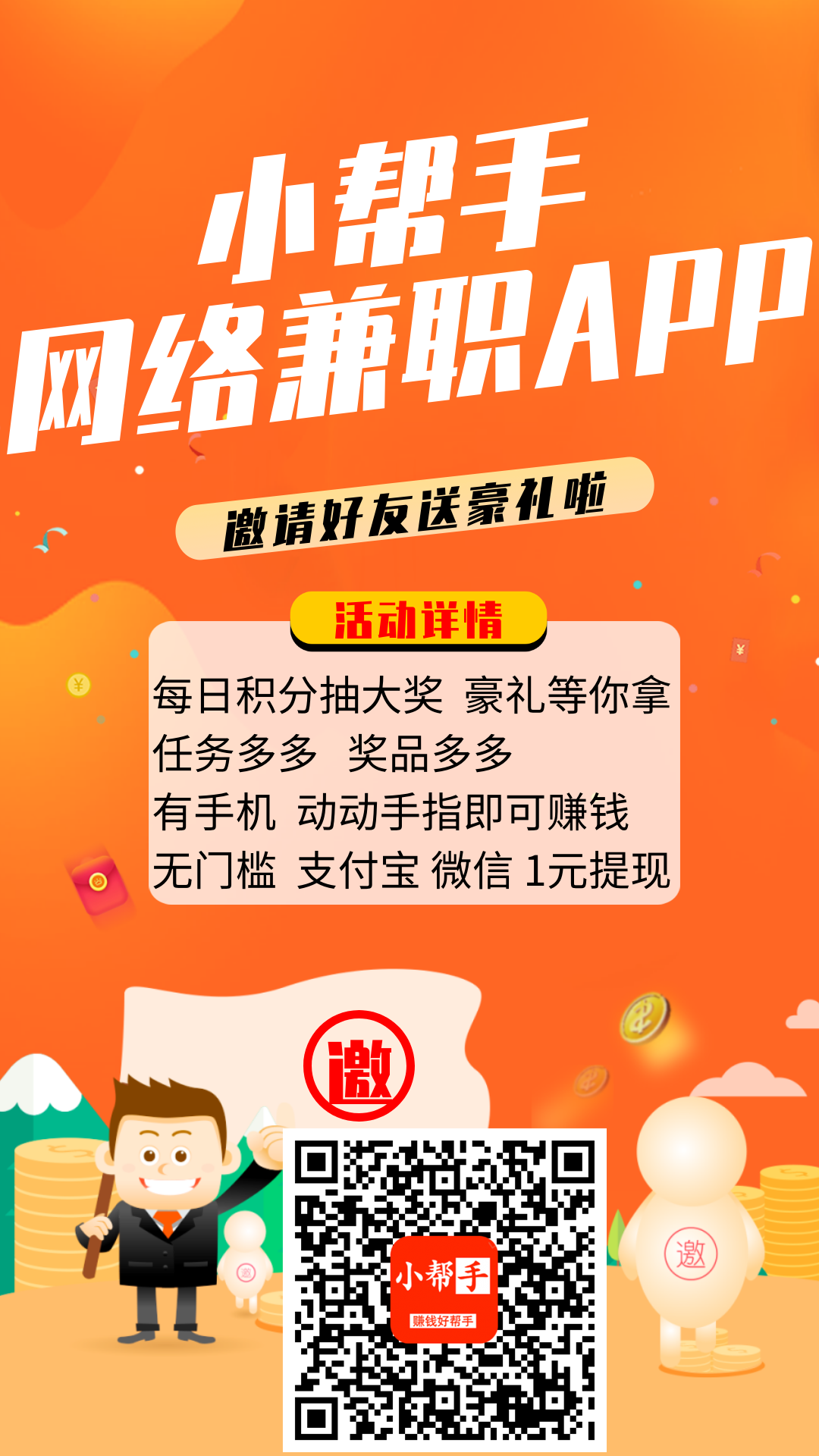小帮手 是一款手机做任务赚钱平台,让你可以利用自己的碎片空间兼职的悬赏平台,自己每月不缺零花钱!用户也可以发布悬赏! 小帮手邀请好友有惊喜,万元金币奖不停,有趣更有钱,只要一部手机,手指动动就能赚钱,外团优选,赏金赚,赚钱实验室,积分抽大奖等等功能, 海量任务,福利圈,简单悬赏,高价悬赏,调查问卷,每日打卡,视频赚,小说赚,闲玩游戏,享玩手游,积分抽大奖,应有尽有的悬赏任务,通过这些方式来赚取零用钱 ,用户可以在平台上做各种自己想做的兼职,想做什么就做什么,你可以分享、可以阅读等,可以给你喜欢的内容点赞,在这个平台赚几十块一天那是简简单单的! 跑外卖跑滴滴还不如做小帮手网络兼职,人脉广可以邀