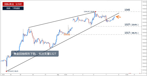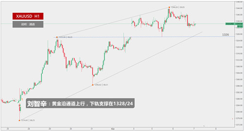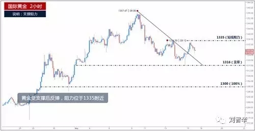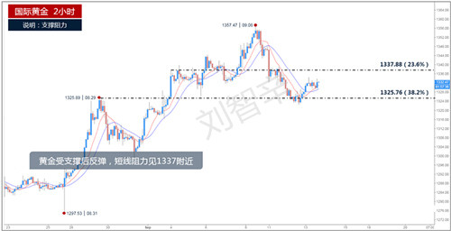 刘智辛:9.13晚评,EIA来袭,黄金原油走势分析及操作建议 本周一开始黄金就迎来一波深度回调,因为避险情绪的预期落空,金价再上周在1355一线碰壁之后,本周直接低开近10美元,并且随后行情进一步扩大跌幅,在周二盘中一度跌破1325美元,然而在尾盘时段,多股意外的助力入场,让金价出现一波触底反弹的行情,最终成功回到13