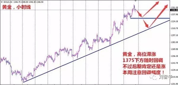 刘智辛:周初可能适度回调,但多头格局未变! 现在谁也不好说黄金能涨到哪里,之前刘智辛认为1350一带是阻力,如果突破那么1375去年高点也堪忧,上周五冲高1357后回落,虽然日线在周尾取得一定跌幅,但有周四开始的上升做支撑,整体跌幅对周线影响不大,而对周线影响都不大,更不要说从1276开始的这一波上涨了,是的,目前上