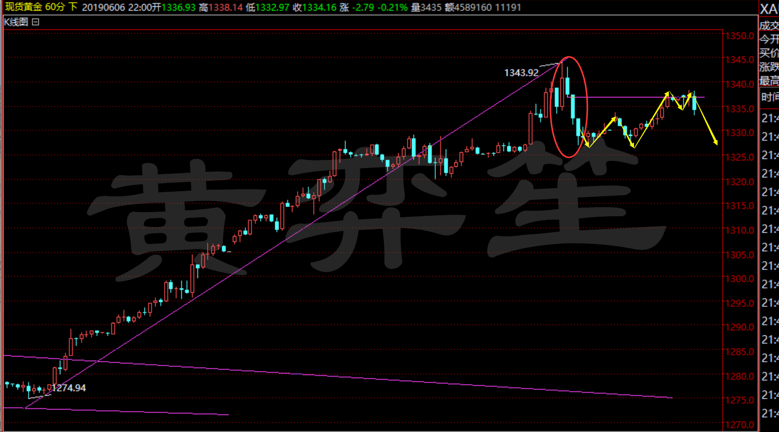 黄弈笙:黄金黄昏形态1340下回撤1338-1337做空!合作分成 长话短说,你遇到问题来问,不用怕麻烦我,我最闹心就是给了意见你也不知道我给了,还觉得我什么都没讲,那样我更沮丧!下面来解析一下后市的情况! 1)黄金压制1340,实际位置1344,在波神凯线结构上表现为诱多,冲高追单则错在高位 2)从趋势线上,黄金冲高顶线压制回撤,高位经过一夜回调形成标准的黄昏形态,后市仍有新低,但非单边,我们强调过,在强涨势中,起码也是消化性震仓 3)我们把压制的位置防守定义在1340下方,诱多的部分很难再上去,再上去就不是诱多,也不是完整形态该有的压制 4)今天亚欧盘短期双底反弹,震荡小突破颈部线位置,