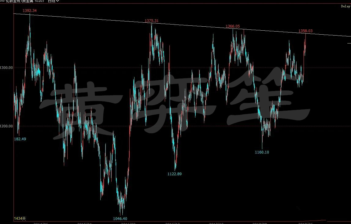 黄弈笙:黄金命运迎来新挑战!美联储决议1338多空界限合作分成! 黄金本周一跳空低开低走形成缺口,周二黄金再次下挫最低触及1319开始反弹,周三周四黄金均以中阳线报收,周五黄金多头白盘继续接力一度上破上周高点1348,最高触及到1358位置,晚盘黄金高位承压回吐日内所有涨幅,日线最终以一根具有16美金幅度的上影线阴线报收。 周线录得四连阳,本周以长上下影线报收,由于周一黄金跳空低开使得周线继续录得阳线,如果是以上周周线收盘价开,我们会发现本周K线会是一个十字星形态。在黄金从1269位置开始黄金一路拉升,周线K线实体不断变大,多头动能一直在碾压空头,而本周看到多空双方之间的力量开始均衡,这会不