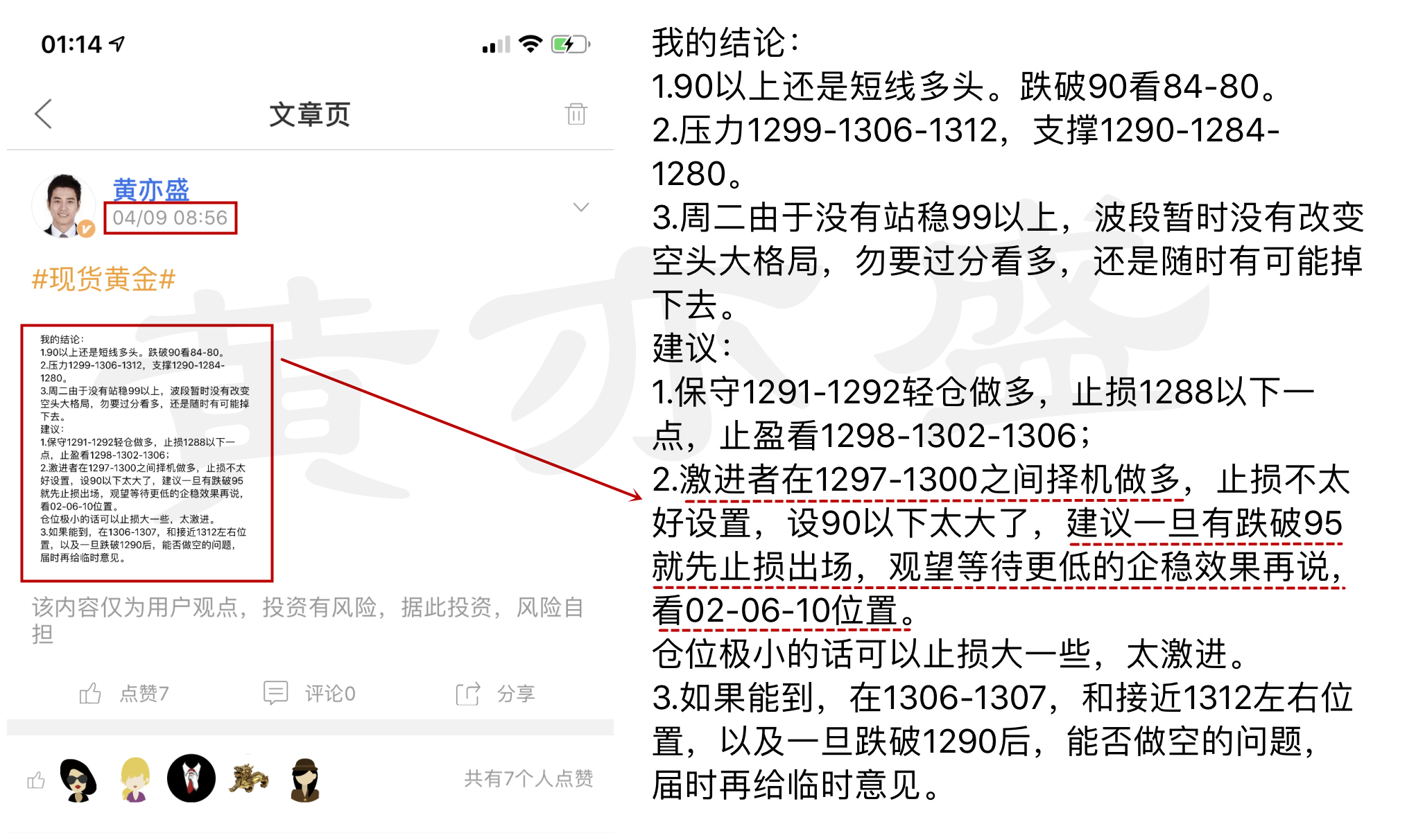 黄亦盛:黄金长上影收阴单周收割29美金!技术合作分成! 你遇到问题来问,不用怕麻烦我,我最闹心就是给了意见你也不知道我给了,还觉得我什么都没讲,那样我更沮丧! 黄某讲了不少循环交易和真假破位收线的问题,在本周二十美金的强震仓中很多同学研判出现问题,主要是方向不明,结构不清晰,交易完全被打乱,这也是多年投资中发现的一个值得诟病的问题,对此给出以下复盘解析: --4月8日黄金交易复盘-- 当日操作鉴于一直承压95趋势线压制,故而第一单选择1296去试仓空单,无奈周线收线十字星,第一张空单被止损于前置位高点,亚盘上涨,欧盘延续不回撤,美盘必破高,秉承这个原则,空单止损后先观望! 美盘拉升至1303