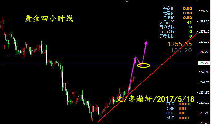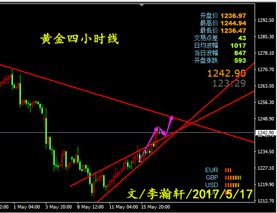 经过昨日的横盘整理突破了4小时下行趋势线的压制,同时坐稳1235.5顶底转换口。打破了此前的弱势格局,短线反转成功。同时台阶上升临界点由昨日的1230直接上移至1236.短线而言只要不下破1236保持低多思路仍为首选,慢涨行情虽然伴随回调,但也会慢慢收复失地,不宜过早看空。以免想着多空通吃,最后多空皆失。既然趋势结构看