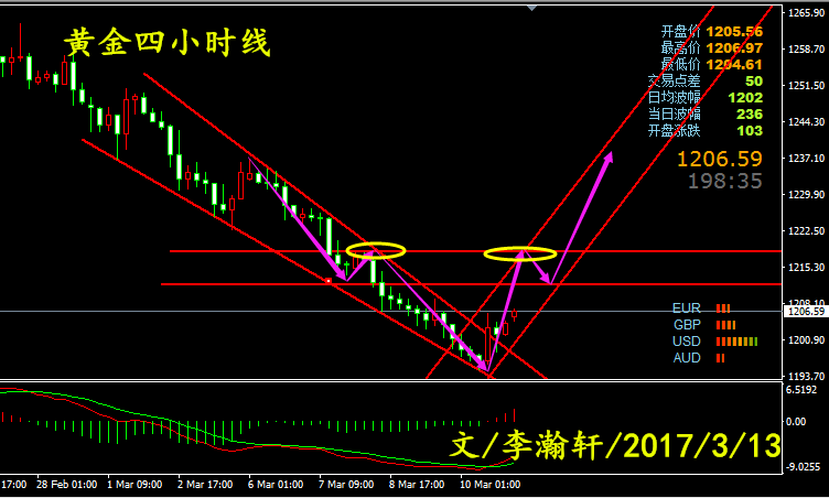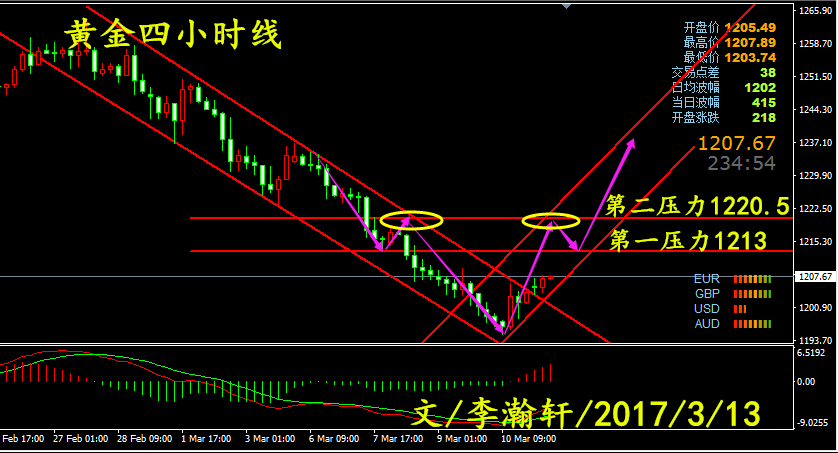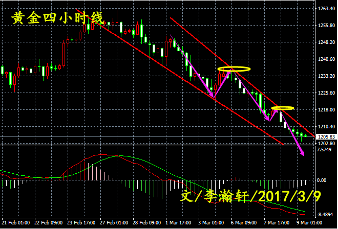 上个交易日美国公布的ADP数据表现强劲,2月新增29.8万个就业岗位,为2015年12月以来最大增幅,远超路透调查的经济学家预估的19万个。向好的经济数据再度巩固了美联储下周加息的预期,美元指数再度走强,带动美元兑日元有所上涨。而黄金则承压下行。 黄金的价格一直在不断探新低,昨天最低触及到1206附近,日线开盘在1215附