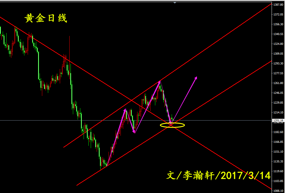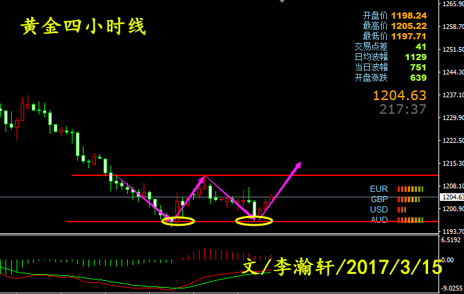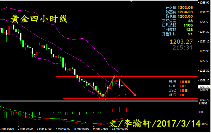 黄金呈现短线下挫态势,随着美联储本周加息临近,多头有点退缩,1200关口岌岌可危,目前金价在1203美元附近运行。目前市场对美联储本周将加息的预期很高,这对金价构成拖累。金价对美国利率上升很是敏感,因美国利率上升提高持有黄金的机会成本,同时亦提振美元。不过,地缘政治方面将会给金价支撑。本周荷兰将举行大选,同