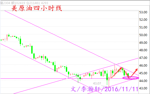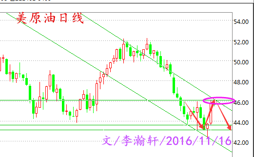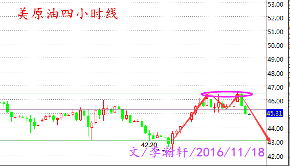 隔夜油价走出大涨行情,主要因OPEC计划在11月30日召开限产会议,市场希望该组织能将产量控制在3250-3300万桶之间。同时有报道称几位OPEC成员重新加入最终的限产协议来克服该组织产油国之间的分歧,此举对原油产生提振。周二油价开盘价格43.74美元,最低价格43.48美元,最高价格46美元,收盘价格45.70美元,整体涨幅近6[%],