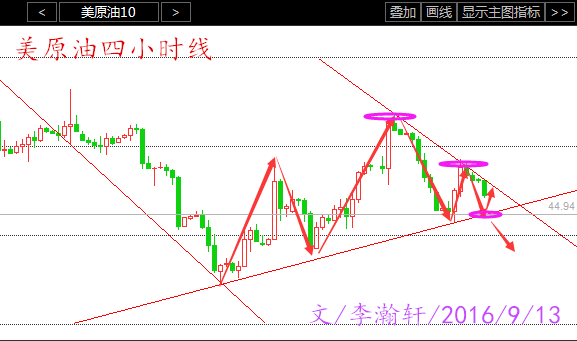 今晚EIA行情着实不错,由于EIA数据小幅利多,原油短线大涨1美元,随后便迅速回吐此前涨幅,与本人思路完全吻合,在欧盘时段本人就已经在45.5美元布局了原油的空单,详情参考(李瀚轩:API迷惑市场EIA谁住沉浮,9.14原油沥青白银布局),欧盘至美盘时段原油缓慢回落顺利跌破本人的44.7美元,最低触及44美元后在EIA利多数据的提