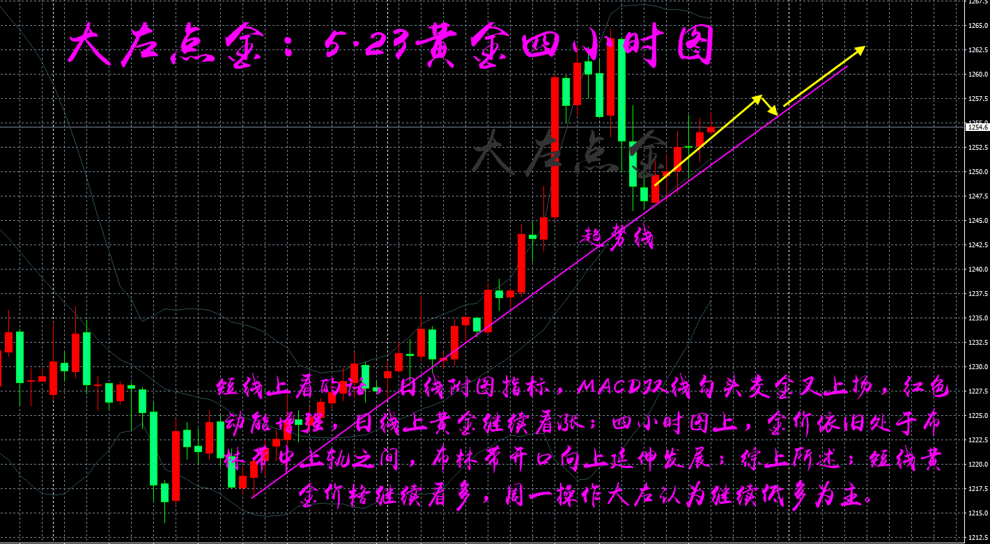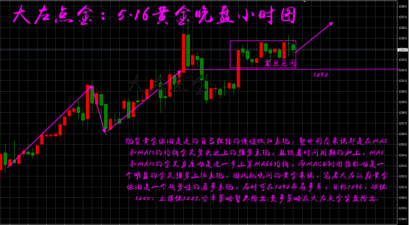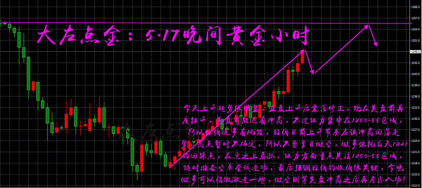 大左点金:5.17黄金多头强势勿追 试探压制1258尝试空 做多位置也是及时,出场也是到位,人生完美也不过如此,当然如果一定要选,我还是希望生活简简单单,一面墙,一张床,一台冰箱足以,昨天在1237之下震荡很久,美盘小时线拉升并突破,也就意味着日线由上周的逼空上升,正式进入反弹阶段,确立了日线的反弹节奏,昨天做