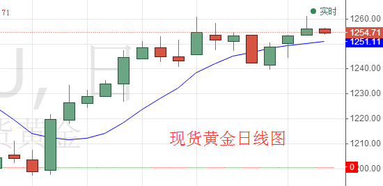 国际金价今日早盘延续前期跌势,不断震荡回调,目前交投于1250美元一线,然而美元指数已经反弹至100关口上方,今晚还有三大美国经济数据来袭,国际金价还会继续下行吗? 现货黄金行情走势分析 隔夜黄金震荡上行,最高触及1253一线,最终日线级别收取一根带下影线的阳线。由于昨天晚间美联储官员大放鹰派言论,提振了美元的价