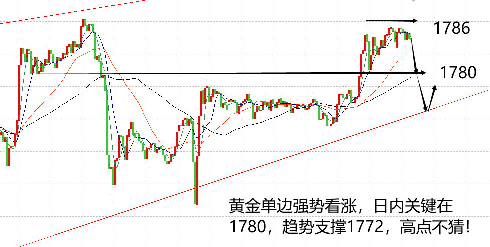 在美指和疫情影响下,美市信心不足,美指不断刷新低,疫情全球情况严峻,市场对黄金避险的能力不断提振,金价十年难一遇,屡创新高。这对于黄金投资来说是机遇,错过这个行情估计未来十年,二十年难得一见。毫无疑问,交易方向顺势做多即可,我们的原则是不猜高点,不做顶部,找准日内的回落低点看顺势上涨空间。 早间黄金再次直接上涨,高点基本找不到合理的预测点位,所以近期在某个点位做空黄金,一定能有有效获利的基本是扯淡,没有实时根据。既然黄金很简单的疯狂上涨,做为交易者也就很简单的跟风疯狂做多就可以。在这里要注意的是,千万不要抗空单,如果做了空单一定记住合理止损,不要拿本金在这种行情中当多头的炮灰。 黄金目前高点