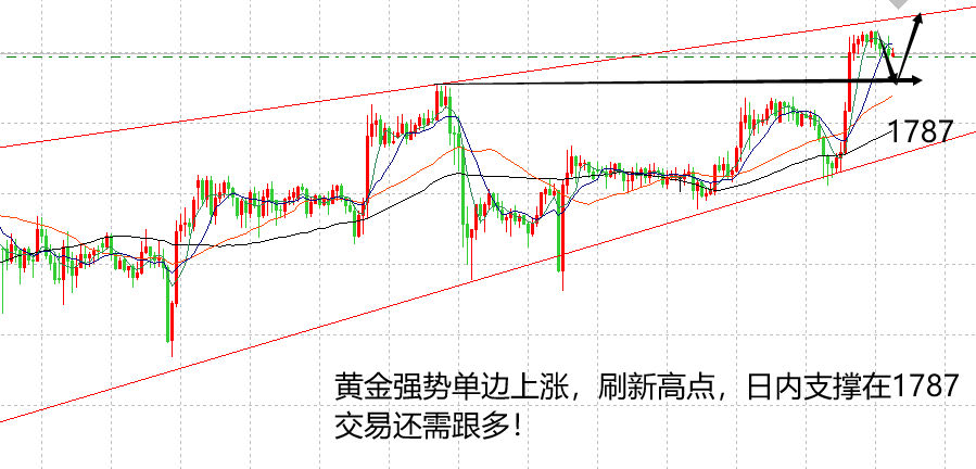 其实市场没有数据,也没有什么消息面,只不过是买盘比较强势。黄金在确认了1772的支撑后,出现了单边大涨,一波直接冲高至1796,大涨24美金,值得注意看的是倪老师预测出了亚欧的下跌空间,1782空单止盈,但没有看出美盘的上涨,通过复盘可以看出,欧盘下跌至1773之后,形成的二次做空形态非常明显,但欧美盘不连续,美盘急跌至1775,有诱空的表现,当时30分钟线形成一根长下影线的光头k线,已经给出了市场有大量买入的信号,后期2小时内上涨是理所当然的,因此,现在看来,周二黄金的上涨毫无非议。后期行情交易需要更加的谨慎,细致。 早盘正常开盘在1794附近,同样的道理,多头趋势下看涨黄金,但亚欧盘