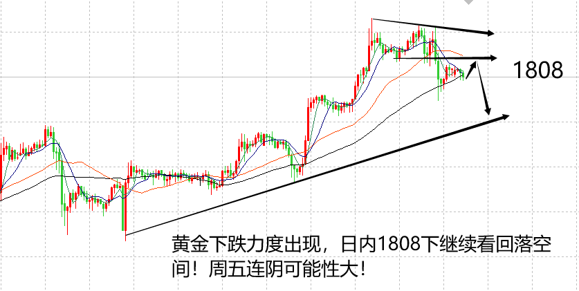 周一黄金表现震荡,整体是先涨后跌,虽然高位冲至1813,但没有影响倪亿柳分析团队坚持1808的空单,经过一个午夜行情,黄金最终成功大跌,出现低点1798,空单成功止盈,获利9美金。 目前黄金价位在1798附近,日线虽然没有连阴,形成标准的高位三只乌鸦形态,但形成了长上影线的锤子线,也表现出了高位强压制,周初转弱,或持续看跌黄金。在市场缺乏消息面的影响下,主要参考技术面交易,技术面走势占优。 目前黄金在日线范围年内首次破位单边均线5日支撑,亚欧盘或持续下跌走10日均线位置,包括前期低点在1794/1792附近,因此,延续午夜弱势,黄金日内的亚欧盘低点支撑或看1794/1792附近,注意亚欧盘不