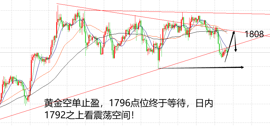 持续关注倪亿柳分析团队的朋友应该都知道,从周三开始,就一直强调黄金会下跌一波,而且明确的给出了1796的位置,从1814多次不破高点开始,就一直高位做空看跌黄金,等待周四的区间破位行情,午夜终于走出力度,最低在1794,给出了预测的1796低点,同时前期布局的空单也轻松止盈,完成了本周行情的预测。 今天周五,本周最后一个交易日,继续带领实盘稳健获利,取得佳绩。目前黄金收线在1797附近,午夜虽然下跌,但明显不是极弱行情,前面讲过,黄金强弱点在1792,只要1792点位没有破位,就不算极弱状态,交易不是反弹空,因此,周五黄金还是看高位震荡。 技术面体现在日线和H4周期,日线周期以一根小阴线破位