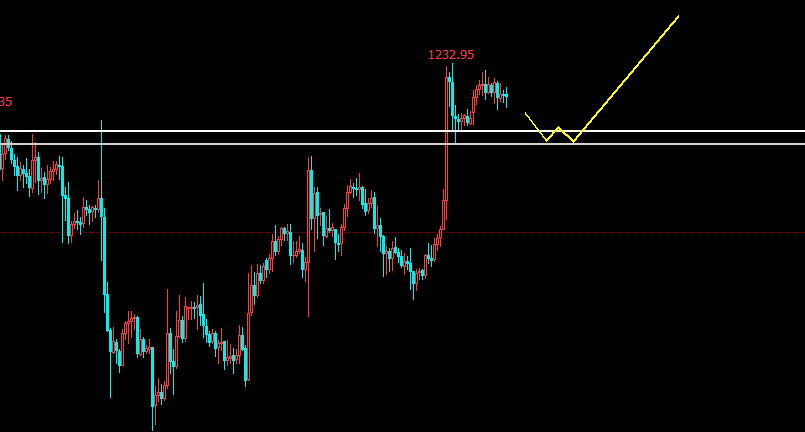 黄金到目前为止还是一直都是高位震荡,从上周黄金开始反弹的时候黄金的亚盘和欧盘的节奏就很慢,然后美盘前走一次拉升,后半夜走一个修正,黄金上周五的拉升,按道理来说是会有一定的回落,所以我周评的文章中也是提到过,周初黄金回落直接多即可,虽然黄金还是受到上方的1233的压制,但是周线转阳和日线的支撑,周初依旧还