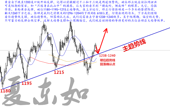 夏东如:7.12金价反弹多看少动,利好油价回落做多! 子夏为莒父宰,问政.子曰,无欲速,无见小利.欲速则不达,见小利则大事不成.古人诚不欺我,做事不要单纯追求速度,不要贪图小利.单纯追求速度,不讲效果,反而达不到目的;只顾眼前小利,不讲长远利益,那就什么大事也做不成。交易无它,唯有持之以恒。 昨日,金价基本维持在1210