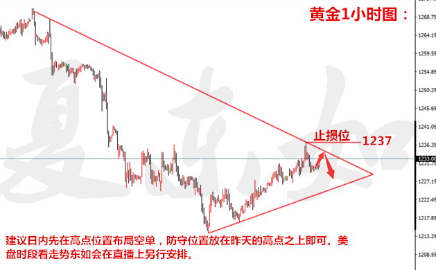 夏东如:5.16金价受趋势压制,美盘前坚定看空! 作者:夏东如 黄金,昨日整体走出冲高回落,并且价格压制在前期下跌口1236-1237之下,日线以倒锤子小阳线收尾,那么今日的走势就显得关键了。首先,日线三连阳反弹,但是价格依旧处在前期最后的起跌口之下。另外需要注意,弱市中的三连阳反弹已经是极限,如果继续当做弱势对