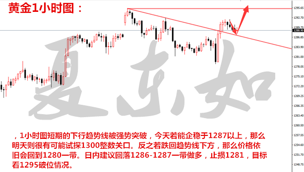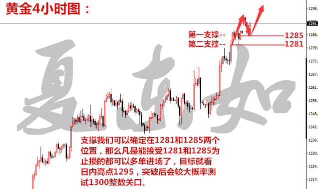 夏东如:4.18黄金将继续测试千三关口,原油蓄力继续看多! 作者:夏东如 黄金,跟昨天东如说的一样,开盘直接高开,并且幅度直接突破1290,而今日高开后,亚欧盘又震荡走低,似乎暗示着避险情绪有一定程度消退,其实主要是朝鲜方面做出了让步,没有在太阳节当天试验核武器,并且第二天的导弹发射也以失败告终,美国对此没作