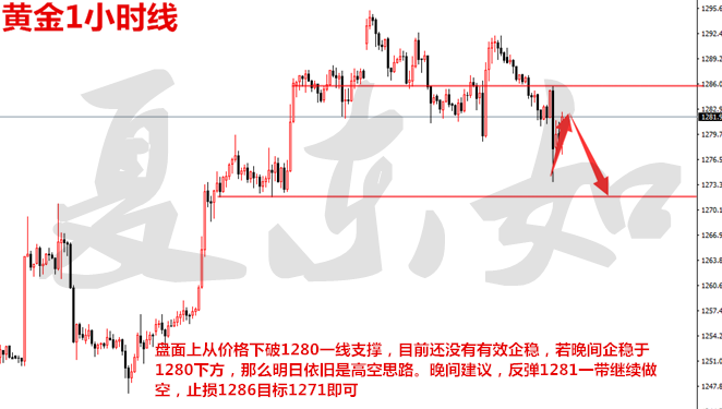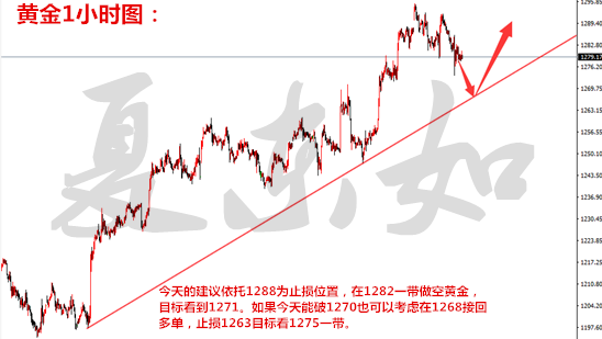 黄金蓄势已久今日能否爆发?油价下行通道守住这里获利! 作者:夏东如 黄金,近段时间的上涨,几乎所有的动力来源都是避险情绪,没有战争危机意识的到来,现在能不能突破1280都还是个问题,更别说前期1295的高点了。当前战争危机有所缓和,避险情绪消退时,黄金调整下跌也是且合情合理的。目前的基本面,无论是法国总统大选