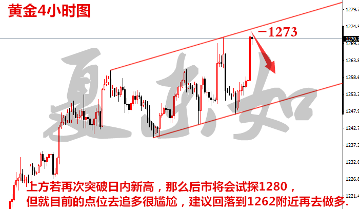 夏东如:4.13黄金休整蓄力上攻,原油回落是做多机会! 作者:夏东如 黄金,今天早间开盘是延续了昨天晚间的上涨,最高是触及1279.9,几乎就是相当到了1280了,行情冲高受阻后价格持续回落,就目前的走势来看处在1270上方震荡整理。做晚美盘的暴力拉升大家也都知道,是属于消息面的刺激,而东如在这波行情上面也是损了单子的