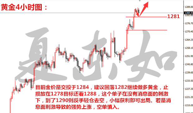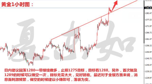 夏东如:4.14黄金蓄势冲千三,原油震荡待破位! 作者:夏东如 黄金,特朗普主导的行情今天已经进入第三交易日了,但今天明显要比前两天弱许多,昨天美盘因为特朗普发布激进涉朝言论,引发半岛危机,刺激避险情大幅上升, 导致金价冲破1270。凌晨特朗普又指出美元过高不利于美国经济美元指数跳水,黄金又借势突破1279高点达