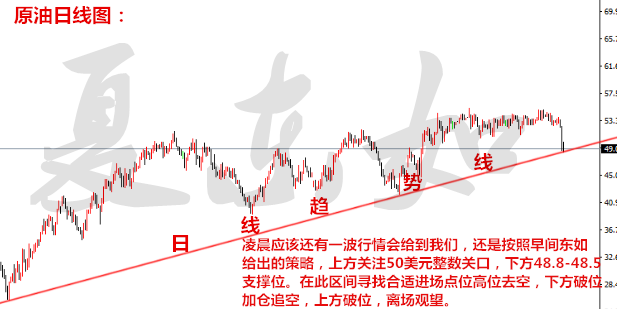 夏东如:3.15黄金企稳迎新高,原油数据迎解套! 作者:夏东如 先看原油,因为相对于黄金而言,原油今天的波动整体较大行情比较给力。昨日油价低位盘整,日K线上报收一根蜻蜓十字线,单从K线形态来看,这根十字线并不是底部,还很有可能是中继。早间东如在文章中给出建议,在48.7做空,又是今天的最高位也又止盈了,还是和上