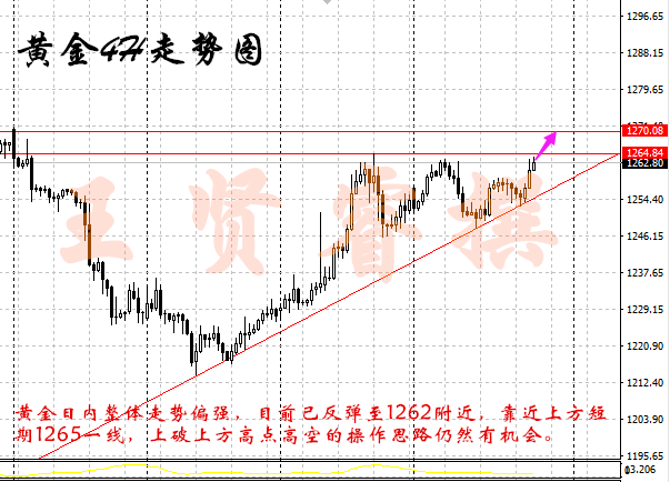 黄金行情解析: 本周的黄金可以说是一路飙升,剑指1265。上周四日线有过回调,周五的反弹也不强,但昨日美盘持续上升,日线方面连续收阳,价格已经很接近上周1265高点,周初直接上升的可能性越来越大,这或许是延续上升的节奏,但这个过程并没有经过周初的回踩二次确认支撑,也就是说上周调整的低点1246已经回调完毕,现在