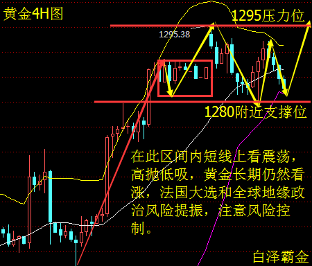 从盘面上我们可以清晰的看出黄金近期的一个走势,冲高无力破位回撤震荡在1278-1295区间。压力位1292、1295、1300,支撑位1281、1278、1273;在没有消息面刺激下,就看在这个区间波动。 黄金基本面分析: 一、法国总统大选 本周末法国即将迎来近几十年来最难预测的总统选举。目前民调领先的四名候选人都有可能闯过23日举行的