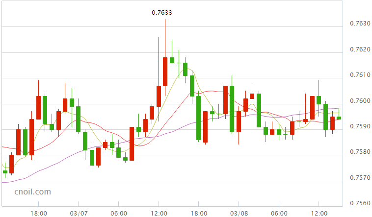 周三(3月8日)公布的数据显示,中国2月贸易意外录得逆差,2月出口年率也有所萎缩,受此影响,澳元兑美元自日内高点快速回落近10点,再度失守0.76关口。 中国海关总署公布的数据显示,以人民币计价,中国2月贸易帐赤字604亿元,前值盈余1720亿元,预测值盈余3545.3亿元。 澳元兑美元一小时走势图 中国2月进口同比按人民币计价