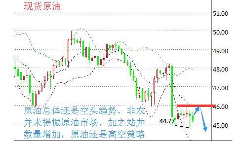 导语:周五的非农就业报告整体表现较为乐观,金融市场剧烈波动,美元、黄金、白银均上演了高速过山车行情,令市场大跌眼镜。 1、油价反弹受阻,美油下周或下探43美元 周五国际油价反弹受阻,美国的非农就业人口暴增,提升了市场对需求增长的预期,美原油一度涨逾1%至45.97美元/桶,布伦特原油9月期货最高曾触及47.22美元桶