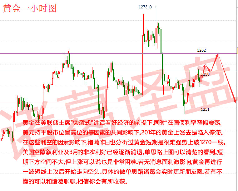 最近国际以美国为首的国家纷纷挑事。国际消息对于黄金影响是非常浮夸的。黄金原油作为战略储备,一但发生战争情况,做多就是赚钱。近期诸葛劝导各位谨慎操作,周五就是很好的例子,消息影响拉动黄金暴涨,很多分析师自以为是,其实黄金1262关口支撑非常强劲,黄金短线看涨已经超过市场本身能承受的范围。周五再次回落是非常