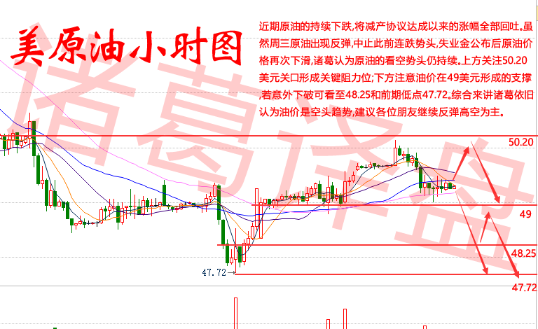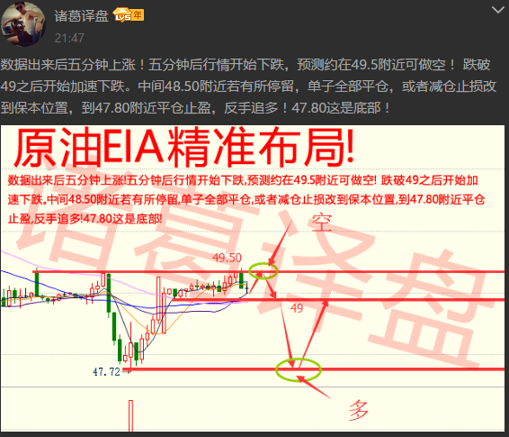 昨日 EIA 行情回顾: 昨日晚间原油行情到现在走的比较慢。预测的小利多。实际结果小利多,美原油五号合约结果出来五分钟内最高点 49.48 , 49.50 附近布局的空单。目前还没跌下来。刚刚达到 48.80 后减仓一部分又反弹上去了。晚间减仓一部分,还持有少部分空单扩大利润。等待下跌。 昨日实仓早间布局原油空单,黄金多单。下