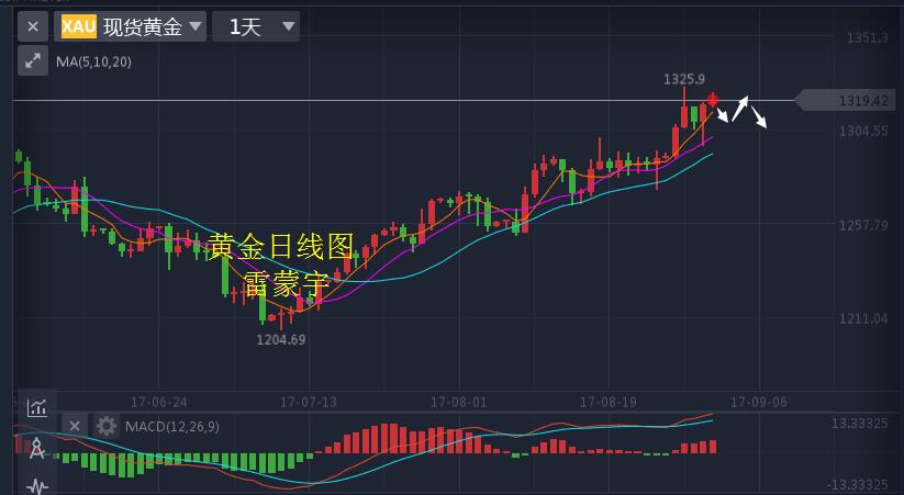 雷蒙宇:黄金猛如虎可高空,美原油反转见低多 九月注定是个不同寻常的月份,上周五利多的非农数据,使黄金一度上涨至上方1328.65美元,收盘于1325.20美元,上周五的非农给黄金多头带来了一个完美的结局。也使笔者布局的单子均获利出局。周一(9月4日),同样的避险事件再度激发市场避险的热情,周一,市场受到朝鲜上周六试核