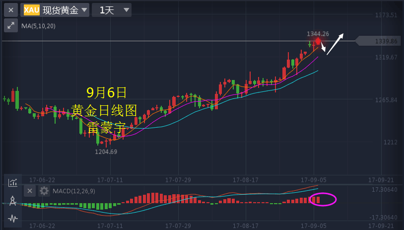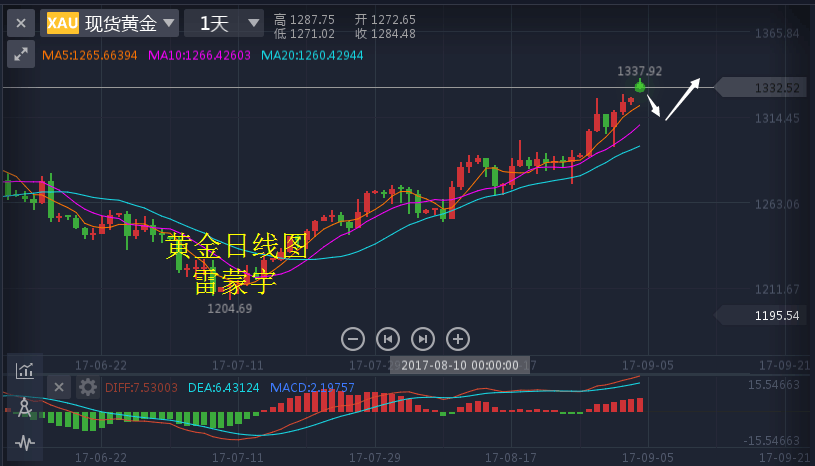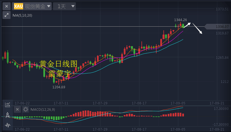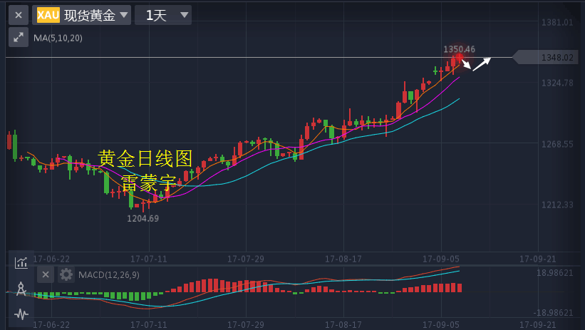 雷蒙宇:9.8哈维飓风助推黄金,美元遭狙,美原油回调多 意外中时常夹带着些许惊醒,周四(9月7日)美市盘中公布的初请失业金数据因受美国飓风影响使其数据大幅利多,黄金瞬间跳涨9美金,触及上方1248美元附近的高位。黄金美盘的大涨让笔者欧盘在1338-1339美元附近布局的多单于上方触及1341美元时遗憾止损出局。但好在笔者美