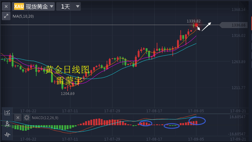 雷蒙宇:黄金回补缺口后再度上行,上看1340美元一线 本周市场对于朝鲜在上周做出的核试验给出了了激烈反映,地缘避险情绪热度依旧不减。在周一刷新新高后,周二行情还是围绕区间再走。先是亚盘低开,后迅速反弹冲击上方1340美元未果,最高触及上方1338.3美元,欧盘开始震荡回落,最低触及下方1326.3美元,此次的回落也早在笔