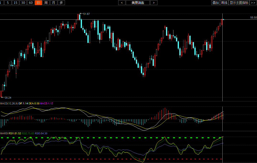 周三(1月11日)亚盘时段,油价跌势暂止,小幅反弹,多次触碰51关口。 受周三早间公布美国API原油库存增加及隔夜伊拉克发表两份自相矛盾声明影响,油价受重挫高台跳水跌下51关口,最低触及50.71美元/桶,刷新5周以来低点。 据中油财经网行情中心显示:截止北京时间15:15,美国WTI原油报51.05美元/桶,涨幅为0.53%或0.27美元;