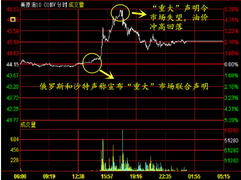 美国10月原油期货价格周一(9月5日)收盘上涨0.73美元,涨幅2.31%,报45.17美元/桶,俄罗斯与沙特阿拉伯借机G20峰会热炒冻产协议,称将在中国G-20峰会上就石油市场发表重大共同声明,但随后所谓的重大声明令市场颇感失望,因双方并未宣布任何具体限制石油产出的措施,油价因此冲高回落。 文/徐语轩,威信xyux68; 周一(9月5日