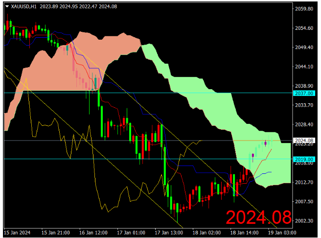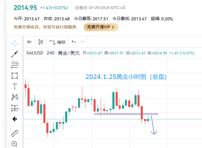 交易是个性化的行为,因此实际操作只能由实战交易经验来支持,投资者无法通过勤奋努力学习来获得实战交易经验。因为实战交易经验需要时间的积累,更需要实践经验的堆积。 【国际黄金( XAUUSD )】 昨日 由于 美国人口普查局公布了强劲的 12 月份零售销售数据,美国强劲的经济数据推动美国国债收益率上升,而交易员纷纷削减美联储降息押注,黄金遭抛售,一度逼近 2000 美元 / 盎司整数关口附近,为 12 月 14 日以来新低。技术面看,黄金上个交易日大幅下跌,日线报收略带上下影线的大阴线,日线级别呈现反转看空态势,中长期趋势看向下调整。 1 小时图下降通道运行,目前价格承压于云层下方
