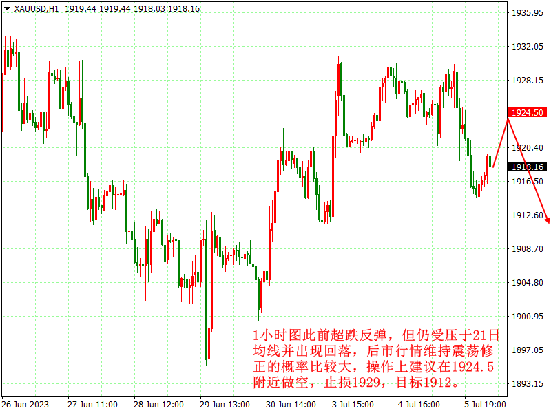 其实不是说技术或基本分析无用或有用,并不是从这个角度去理解,而是说在交易中应该以交易策略为核心去执行,而不是以技术分析或预测为核心去完成你的交易,简单的说就是交易于你的计划,而不是交易于你的分析 。 金价 昨日 走高,因为一些交易商押注最近疲软的美国经济数据可能促使美联储重新考虑其加息轨迹,同时也在等待联储发布上次会议记录,以寻找未来利率路径的进一步线索。 技术面看,黄金 上个交易日震荡偏上涨,日线报收陀螺线,整体仍处于下降趋势中的反弹。 1 小时 图触底反弹态势,目前已经成功站上 13 日均线上方,后市行情有望持续反弹,操作上建议在 1912 附近做多,止损 1907 ,目标 1922-1