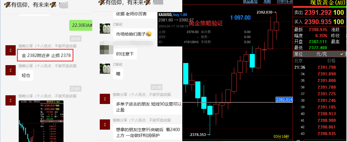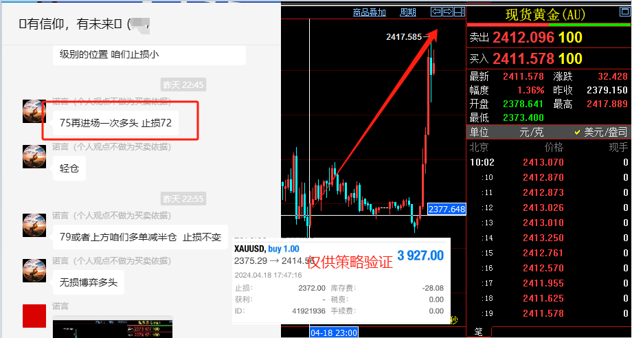 黄金今日早间自2378开盘以来,当前高点测试2418区域。小时线一根巨幅阳线单阳突破2395压线一飞冲天,多头避险情绪再次升温。昨日美盘时段在2375区域布局的多单,用2382做防守,目标看新高,随着早间的突破冲高,兑现了2400区域上方的利润空间。 当前黄金多头强劲,亚欧盘仍以回调接多为主,切忌高风险去逆势博回调。多头如果继续走强,下方15分钟级别以上的支撑恐难触及。盘中即时关注5分钟的K线力度出现止跌即可介入多单,防守在K线低点,保持在4美元的风控博弈大的利润空间。 】 本文客观理性的对后市走势做出方向性判断,文中操作建议仅为作者个人观点,且作者秉承“重势不重价”的交易原则,所以需要盘中