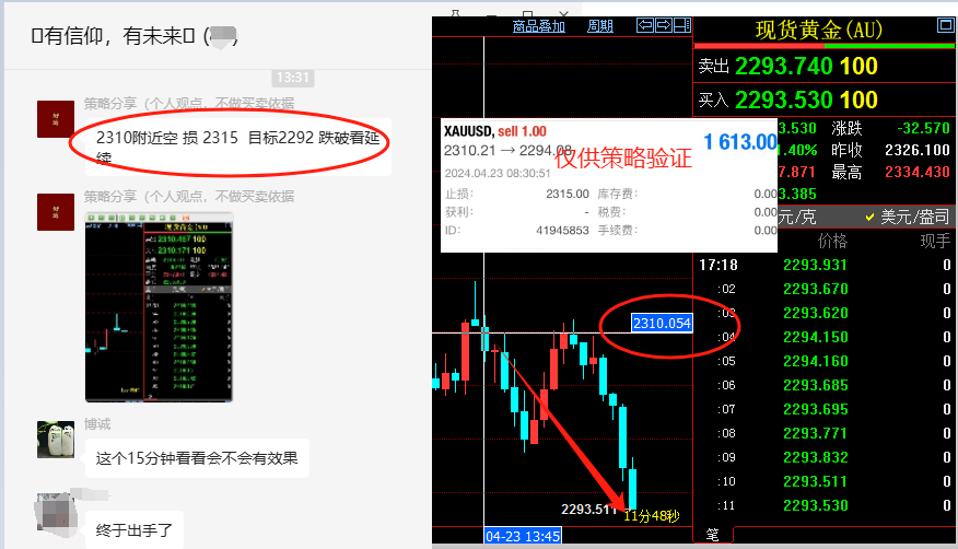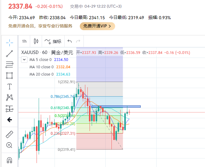 黄金欧盘修正后再次上攻,分析中给出关注2228-2230区域的支撑。实盘中给出该2330区域做多策略,短线已触及2336上方目标位置。今日日内两个小多单双双给出7美元以上利润空间,每笔操作均用 3美元止损博弈,短线走出2:1利润空间。 黄金亚欧盘冲高后,目前在2341黄金分割618小级别有承压迹象。美盘继续关注这个位置的调整,操作点位实盘中实时更新,欢迎交流讨论。 本文客观理性的对后市走势做出方向性判断,文中操作建议仅为作者个人观点,且作者秉承“重势不重价”的交易原则,所以需要盘中实时调整点位, 内容仅代表作者观点,仅供学习交流,并不构成操作依据。如有需求可联系本文作者。盘中交易策略欢迎