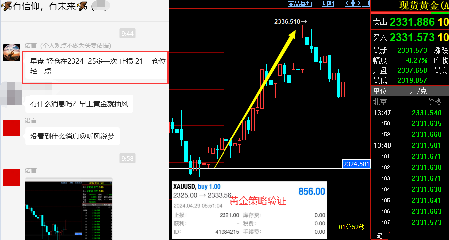 早间黄金在分析的第一支撑位2325区域市场已有一波短线上攻,在2337区域短线承压调整。实盘群2325附近的多单短线已兑现一波利润。欧盘黄金继续修复看涨,短线关注2328-2326区域支撑。 本文客观理性的对后市走势做出方向性判断,文中操作建议仅为作者个人观点,且作者秉承“重势不重价”的交易原则,所以需要盘中实时调整点位, 内容仅代表作者观点,仅供学习交流,并不构成操作依据。如有需求可联系本文作者。盘中交易策略欢迎添加实盘 V信:Br300899 QQ:1211945182