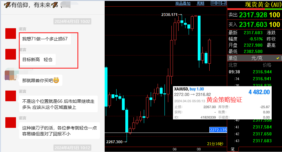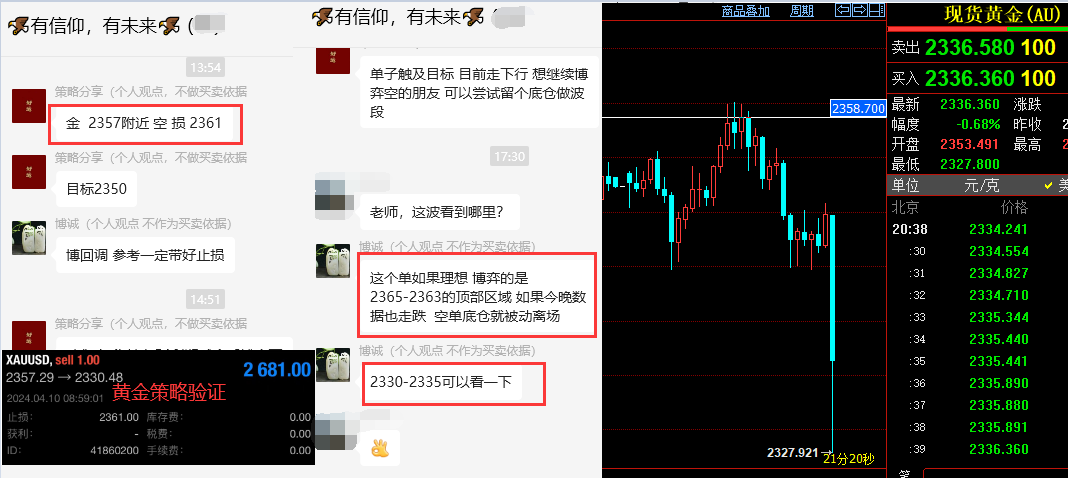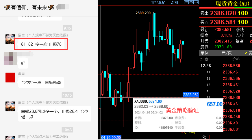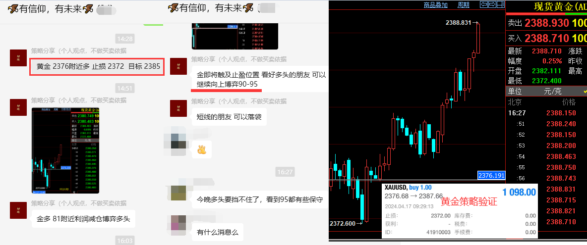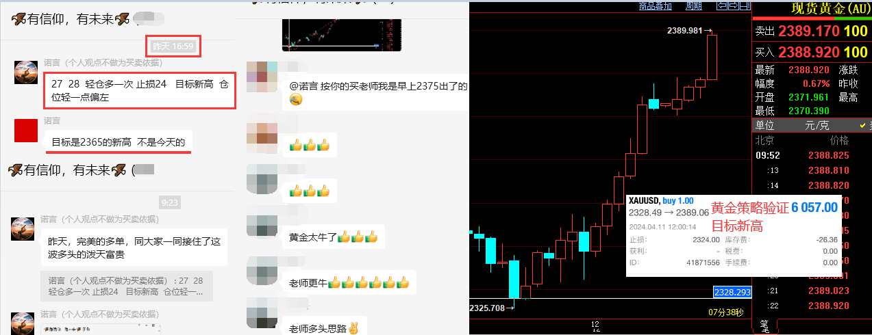 黄金昨对我们来讲,走出来可人的行情。早间文章分享的 2346/47 附近的空如期承压回调,最低来到 2325 一线,盘中抓到一波小回调的空间。重点是欧盘测试 2325 后,咱们实盘群给出 2328 附近多单,用 3-4 美金止损博弈新高目标 2365 上方,盘中指明此单新高非一日之功,虽然初请失业金小幅利空,但不能改变黄金多头的强势拉升,凌晨收盘之际强势刷新历史新高后,当前报价 2395 ,实盘群中看到此策略的朋友以新高目标落袋后,获得了又一波多头的不菲利润。 我们的实盘是免费位大家开放,群内会分享各种交易法宝: 1 ,交易基础大全。 2 ,实盘交易系统辅助。 3 , EA 跟单账户