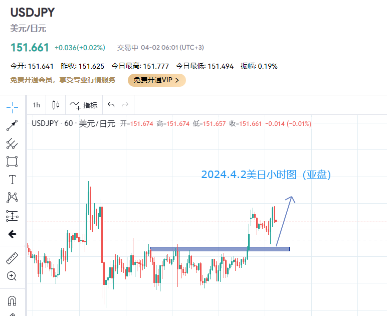 伴随着日本央行的利率决议之后,美元兑日元3月20日测试151.80后,日线围绕151.80-151.00高位区域已连续震荡10个交易日。 从盘面上看,经过高位的震荡修复之后,昨日日线收阳,后市大概率进一步上攻,打开新一轮的上攻行情。 美日小时级别关注151.40-151.50区域做多机会,多头关注151.80-152.00区域上破机会。该区域上破后,后市延续的上涨行情将会给多头头寸带来新一波利润。 本文客观理性的对后市走势做出方向性判断,文中操作建议仅为作者个人观点,且作者秉承“重势不重价”的交易原则,所以需要盘中实时调整点位, 内容仅代表作者观点,仅供学习交流,并不构成操作